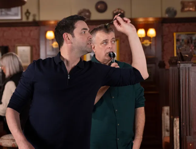 Ben Driscoll and Steve McDonald playing darts in the pub in Coronation Street.