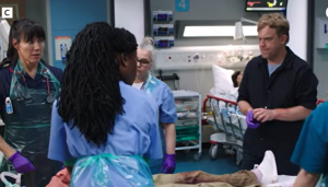 The doctor’s attention flickers briefly away, voice sharpening into the call no one has time to miss.